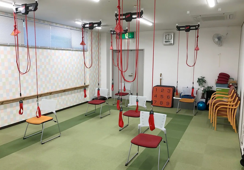 日常生活動作である衣類の着脱、椅子からの立ち上がり、湯舟などの跨ぎ動作、洗髪や体を洗う動作、杖や歩行器の使い方、台所で必要な横歩きなどの訓練をレッドコードやセラバンド、ボールや手すりを使って実施します。